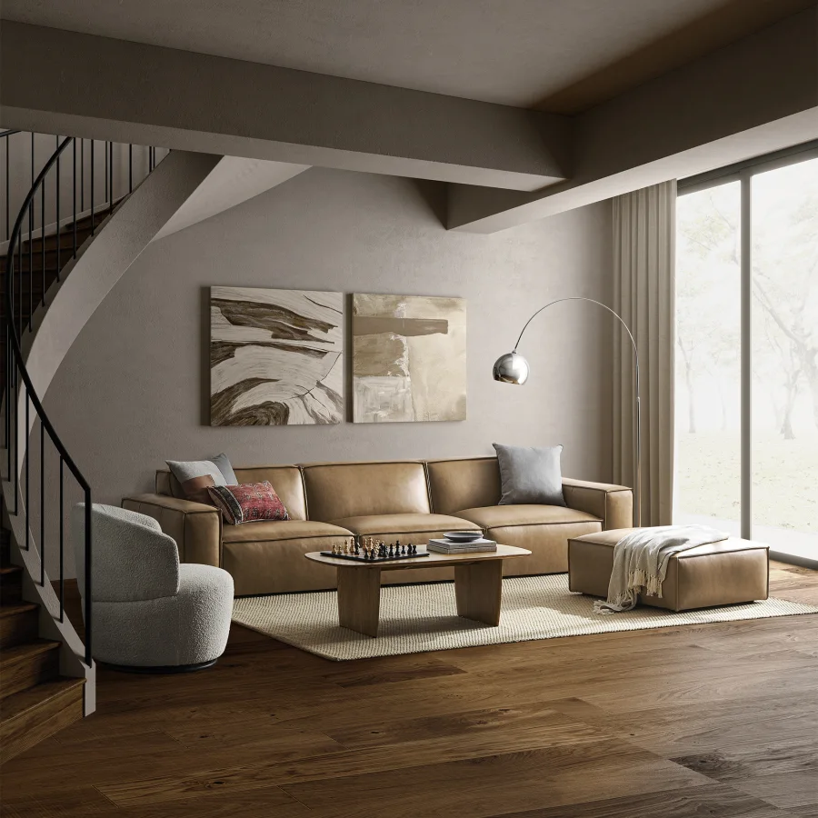 Swathed in a luxurious leather, Jonathan’s modern sensibility shines through even more while keeping to its clean silhouette and lounge-worthy modular seating.